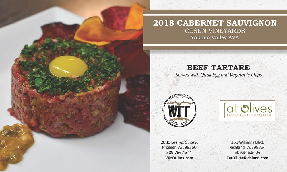 So savory, you can’t get enough of this easy Beef Tartare recipe served with quail egg and vegetable chips from Fat Olives in Richland. A perfect match for WIT Cellars Cabernet Sauvignon!