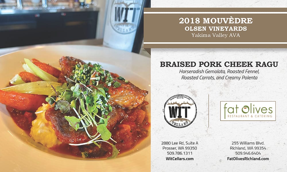 This easy recipe from Fat Olives in Richland for Braised Pork Cheek Ragu served with Horseradish Gremolata, Roasted Fennel, Roasted Carrots, and Creamy Polenta screams comfort food. You’ll want to eat this over and over again all season long! Recipe pairs nicely with 2018 WIT Cellars Mourvèdre.